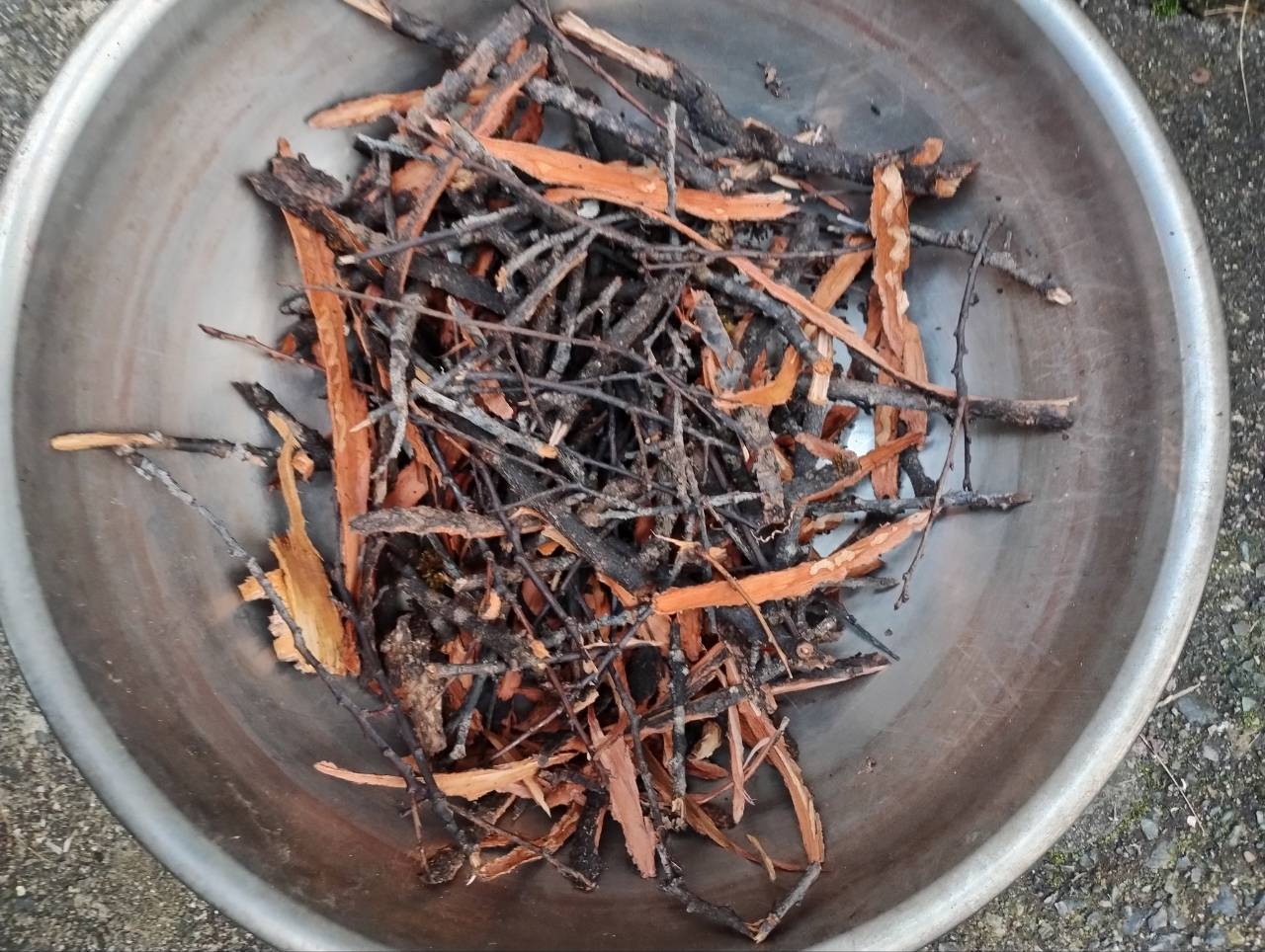 大きめのアンズの枝を剪定したので、生の樹皮をノミで削って染めました。赤みの色が出ます。
